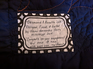 The part i couldn't document with pictures is the quilting in the navy border on the front side. I "wrote" football terms like "touchdown", "football", "punt", "interception"... and on the bottom I wrote "Desmond and Annette". (I owe a huge "Thank you!!" to a quilt guildmate, Terry, for encouraging me to "write" with the machine. it turned out very cool.)